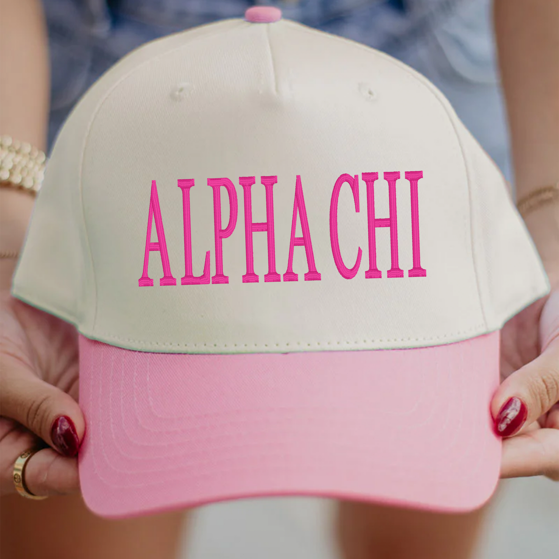 The Alpha Chi Omega hat is a vintage two toned hat designed with style and comfort. Ideal for casual sorority wear or special events like bid day, big little reveal and more!
