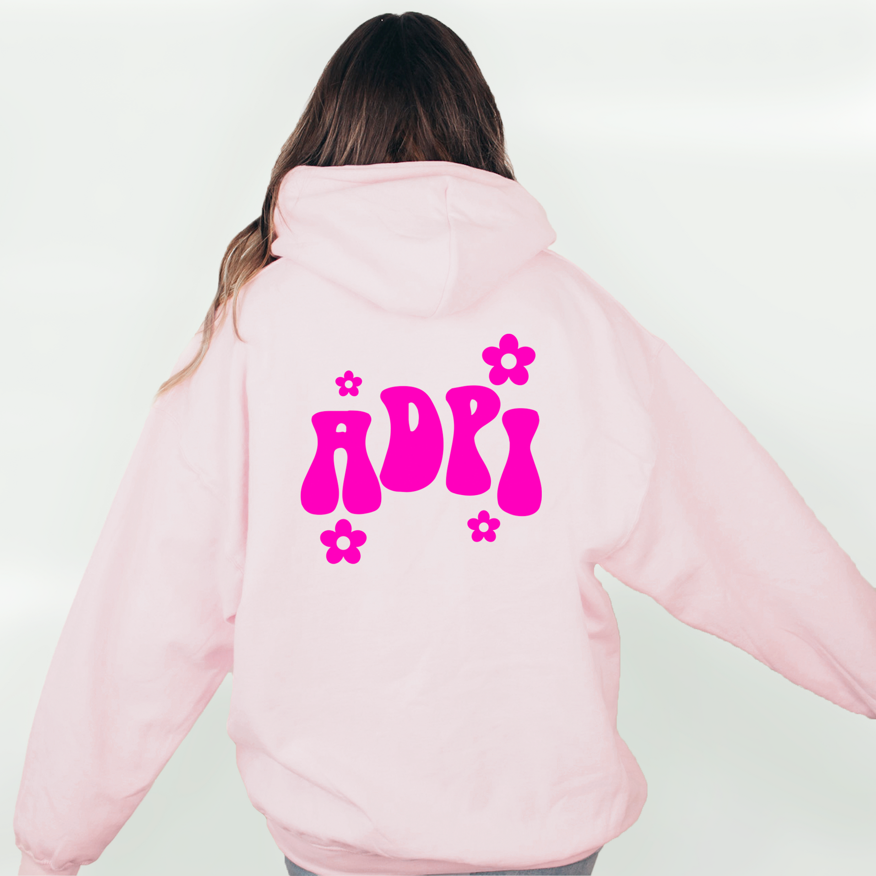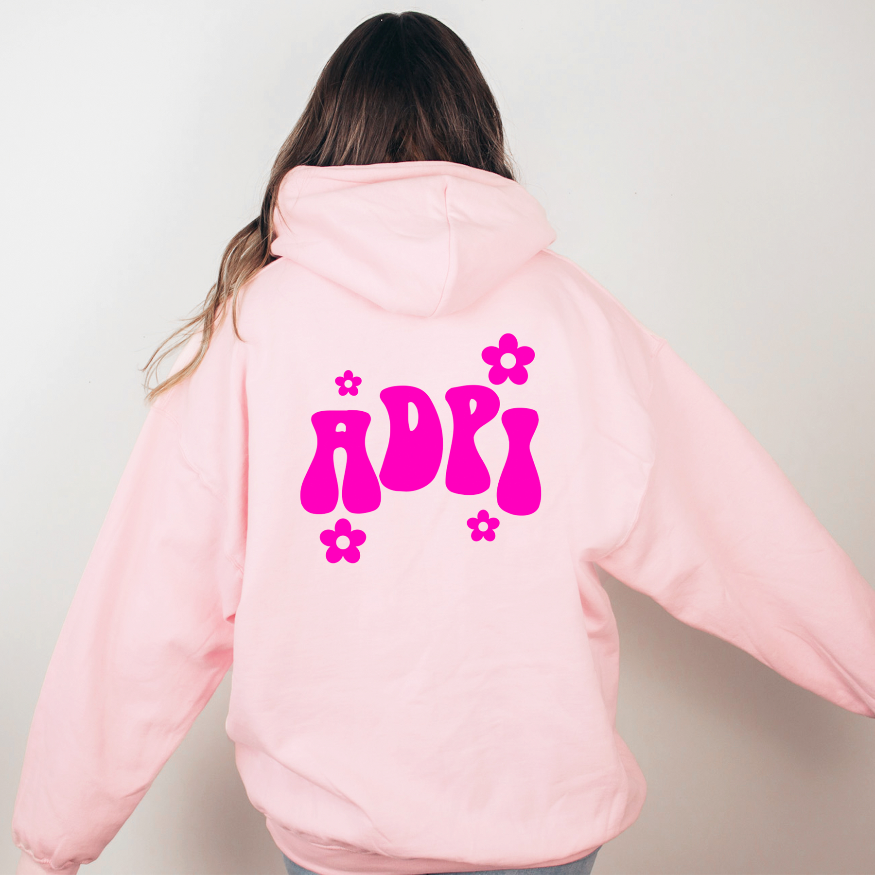 This pink hoodie features a cute retro Alpha Delta Pi floral design! Makes the perfect gift for your big, little or yourself!