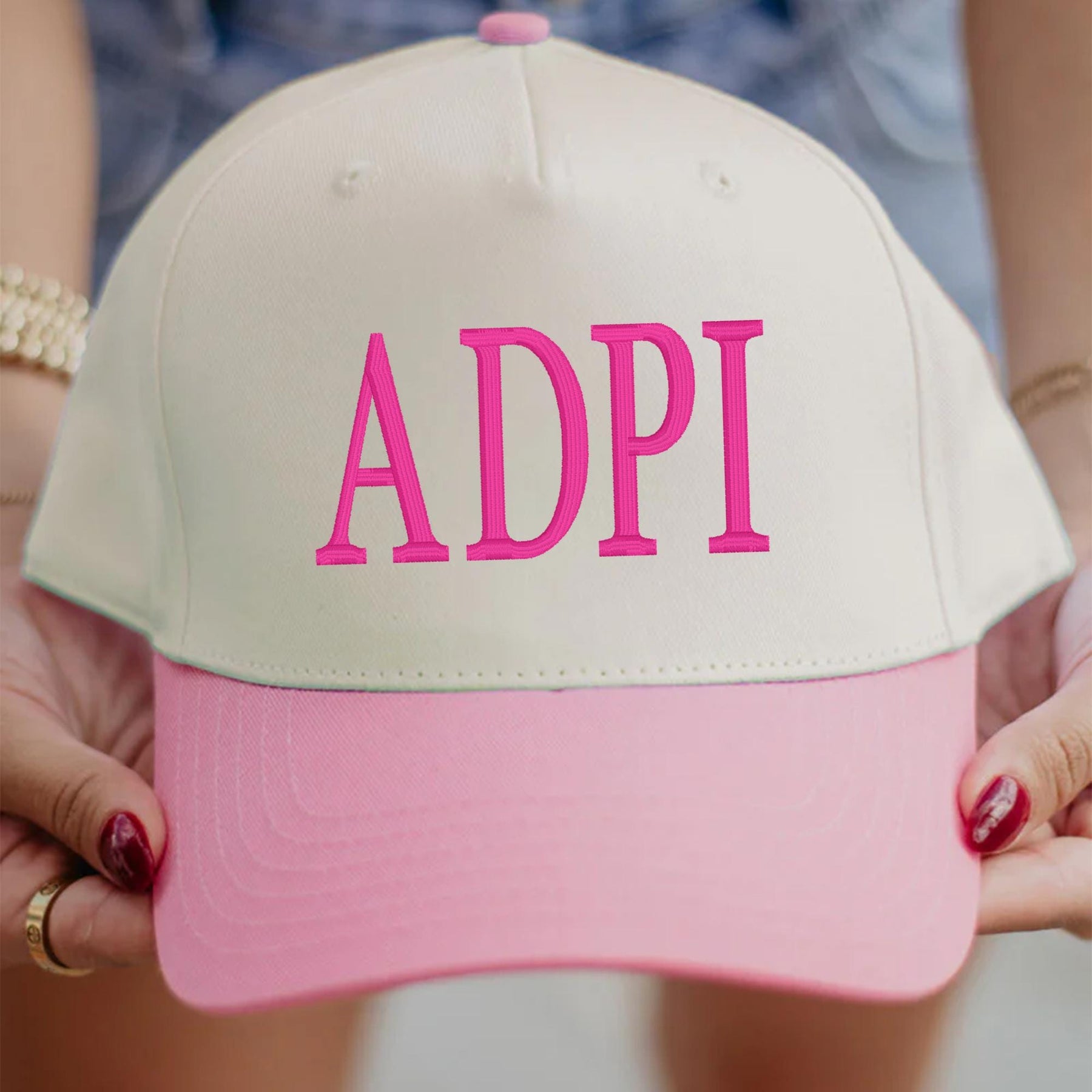 This Alpha Delta Pi hat is a vintage two toned hat designed with style and comfort. Ideal for casual sorority wear or special events like bid day, big little reveal and more!