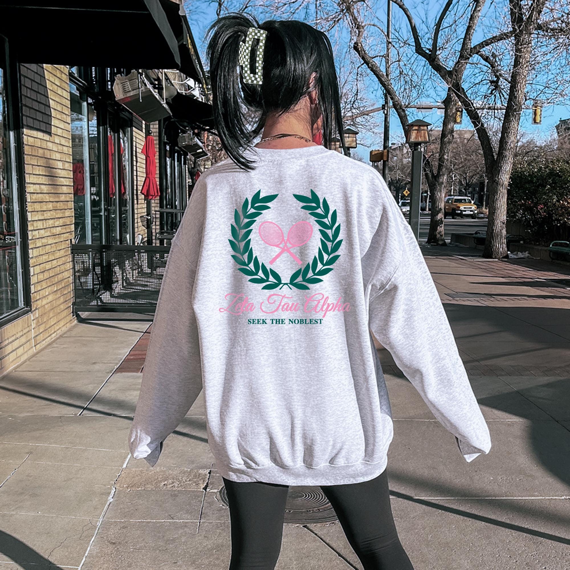 Zeta Tau Alpha Tennis Club - Embroidered & Printed Preppy Sorority Sweater - Ash