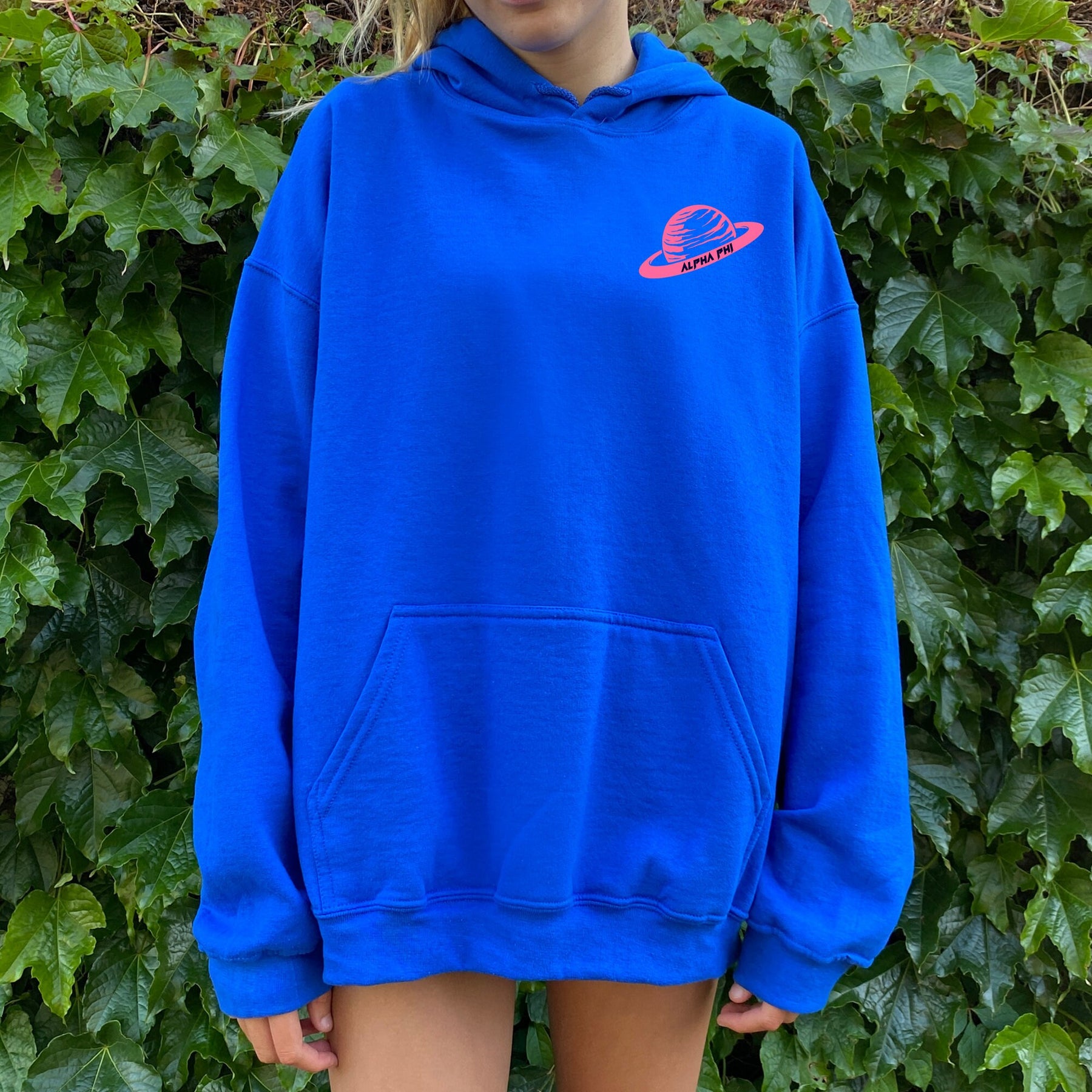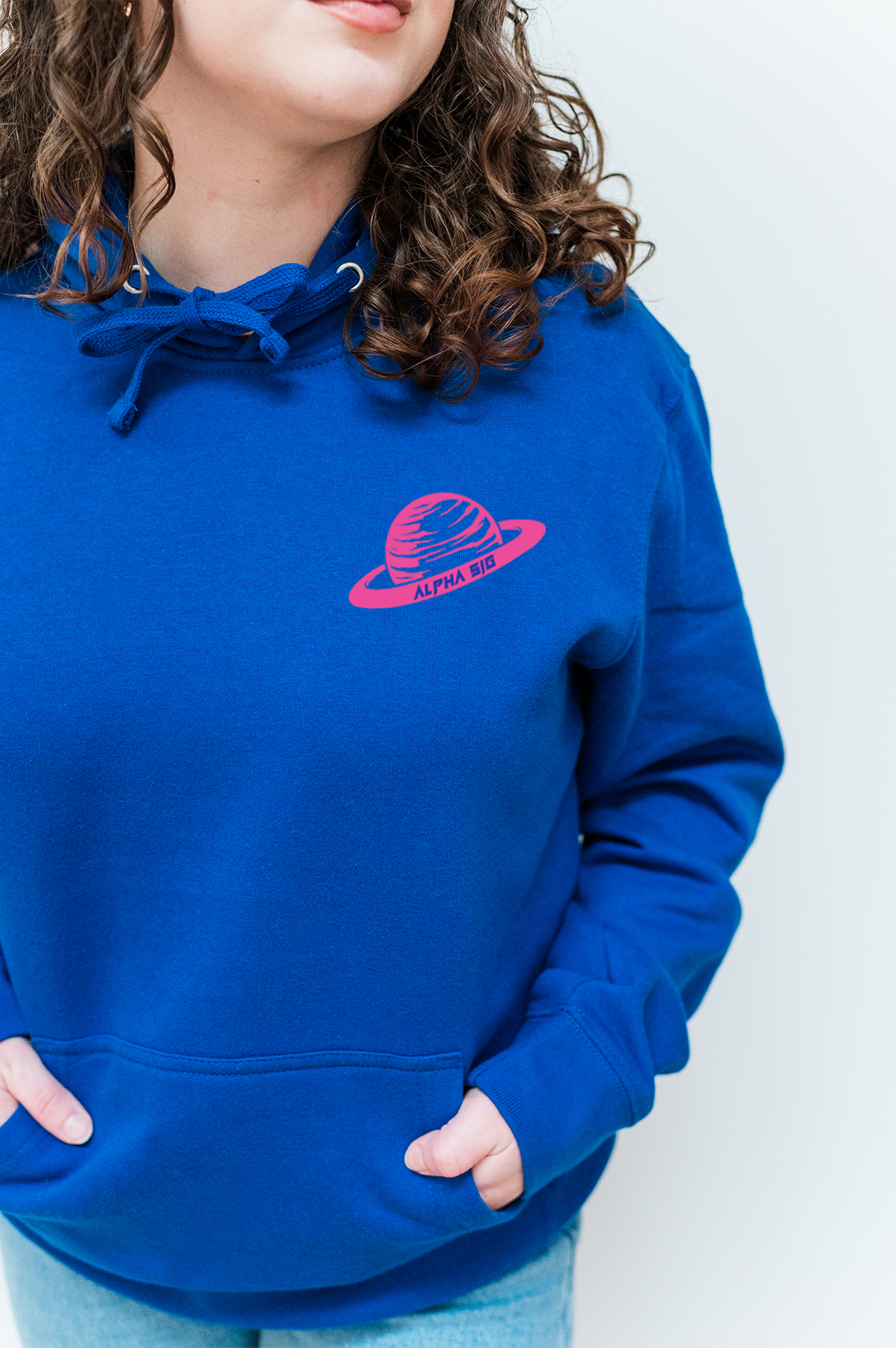 Alpha Sigma Alpha is out of this world and this royal blue hoodie confirms it! Printed with a front and back hot pink and white design, you're sure to turn heads with this soft and cozy hooded sweatshirt.