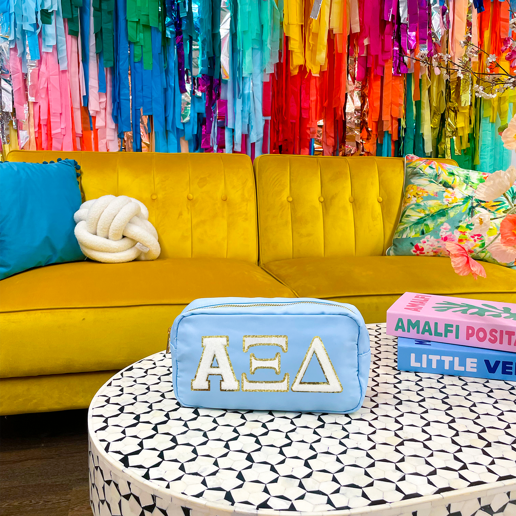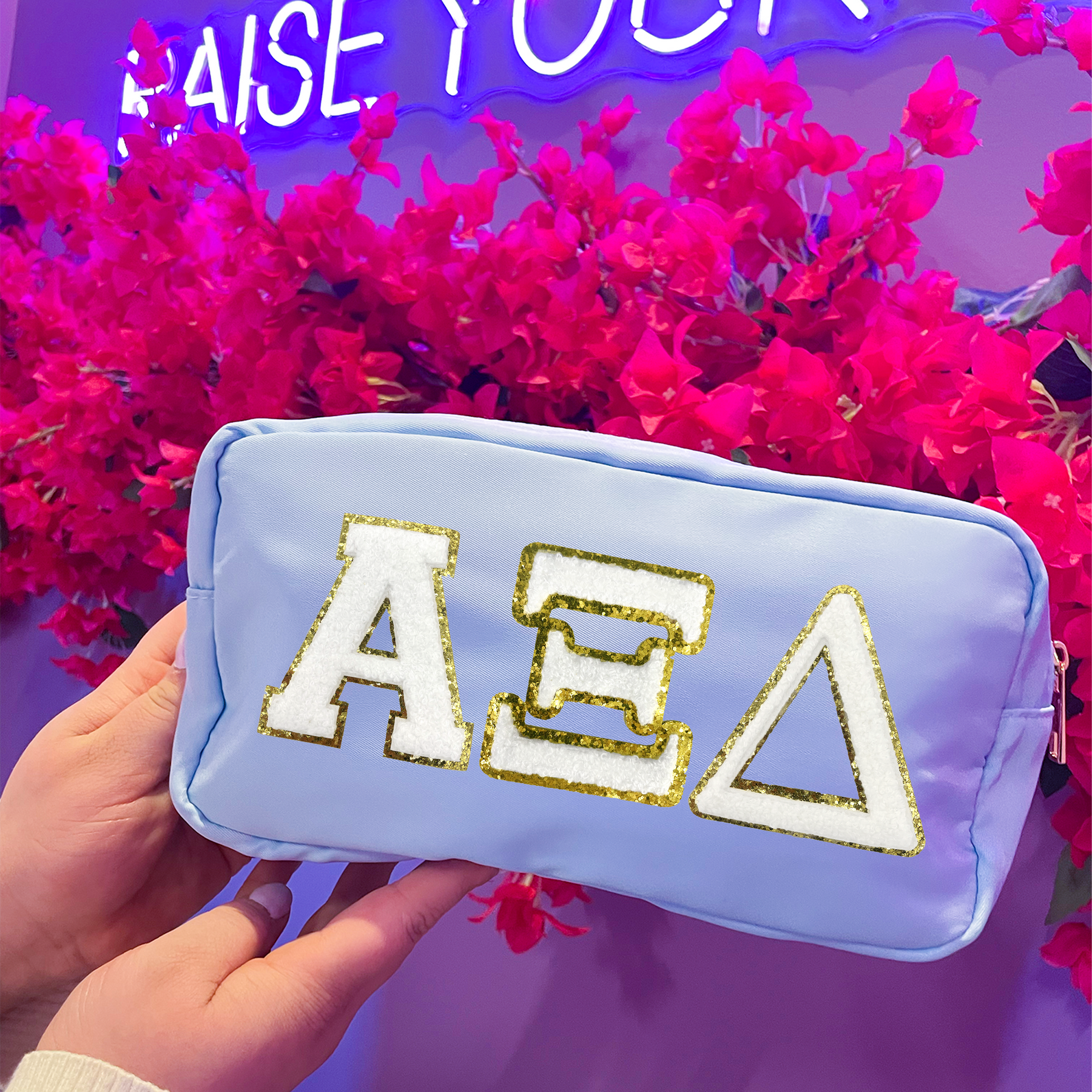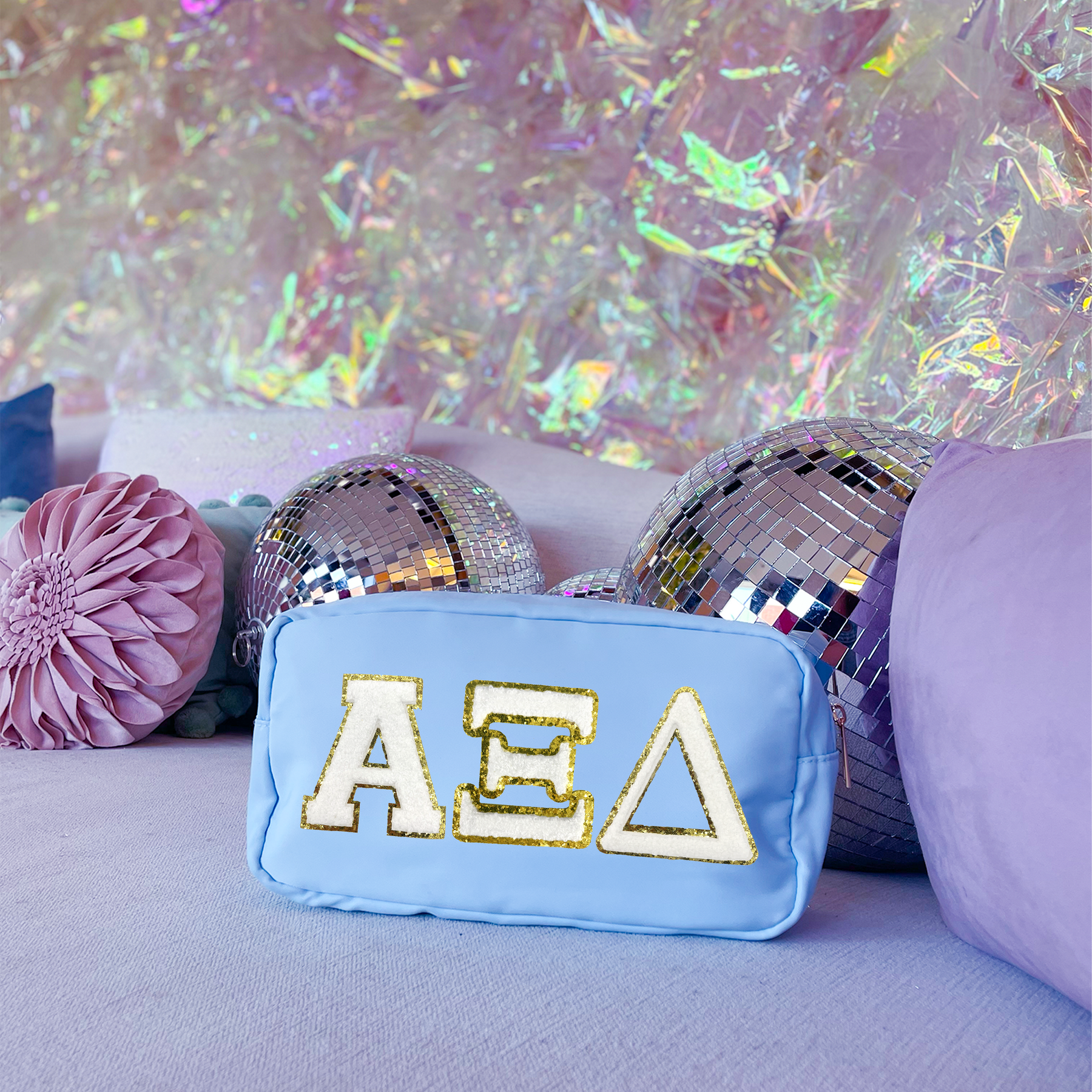 This cute light blue bag makes the perfect gift for your big, little, or yourself! It features soft chenille white Alpha Xi Delta Greek letter patches with gold glitter trim, on a roomy nylon case.