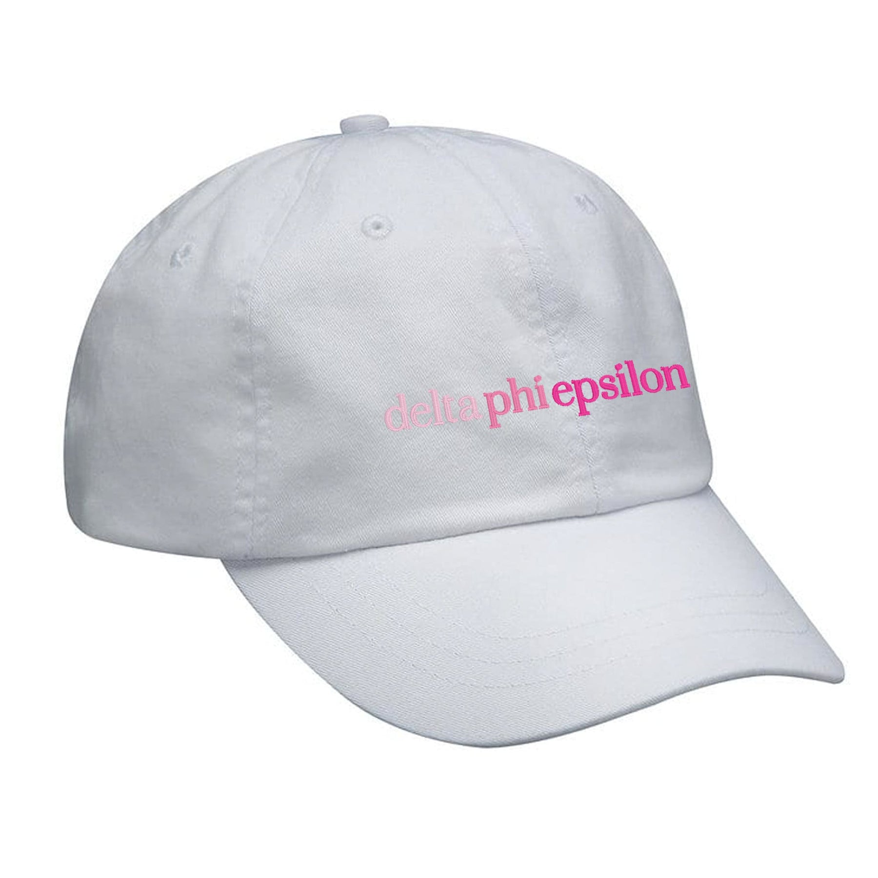 A white unstructured baseball hat embroidered with gradient pink thread colors. The perfect gift for your big/little, bid day, recruitment, rush, etc.! These cute embroidered hats make the perfect gift for any Delta Phi Epsilon member.