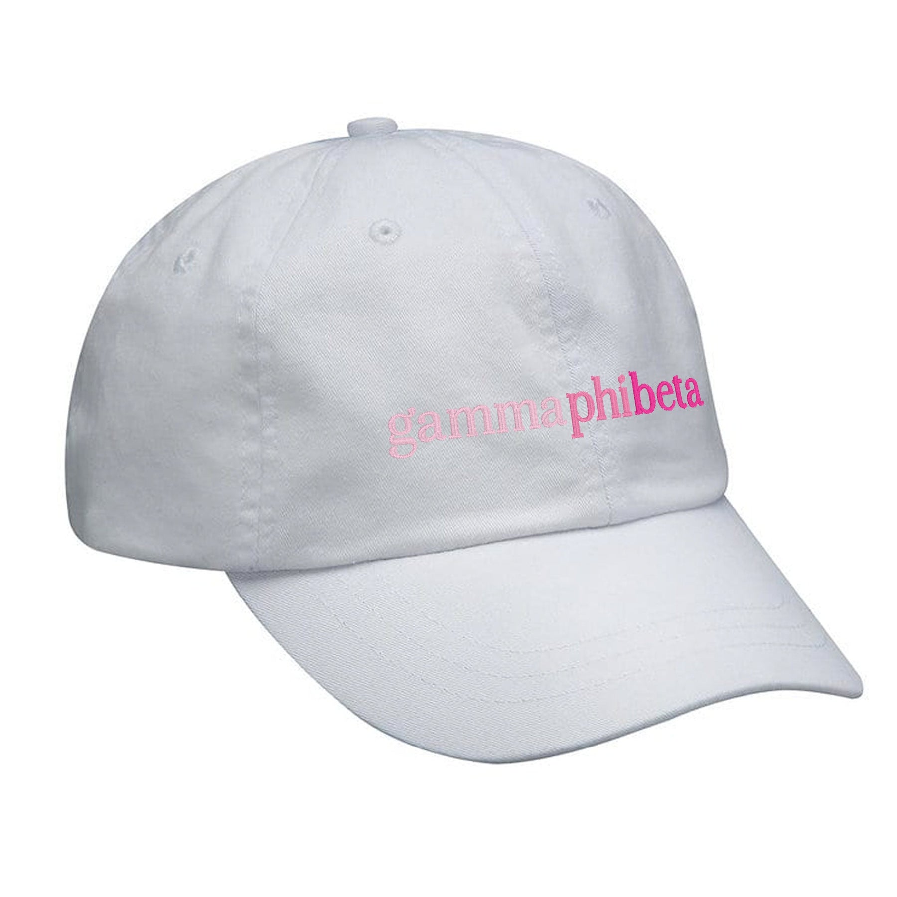 A white unstructured baseball hat embroidered with gradient pink thread colors. The perfect gift for your big/little, bid day, recruitment, rush, etc.! These cute embroidered hats make the perfect gift for any Gamma Phi Beta member.