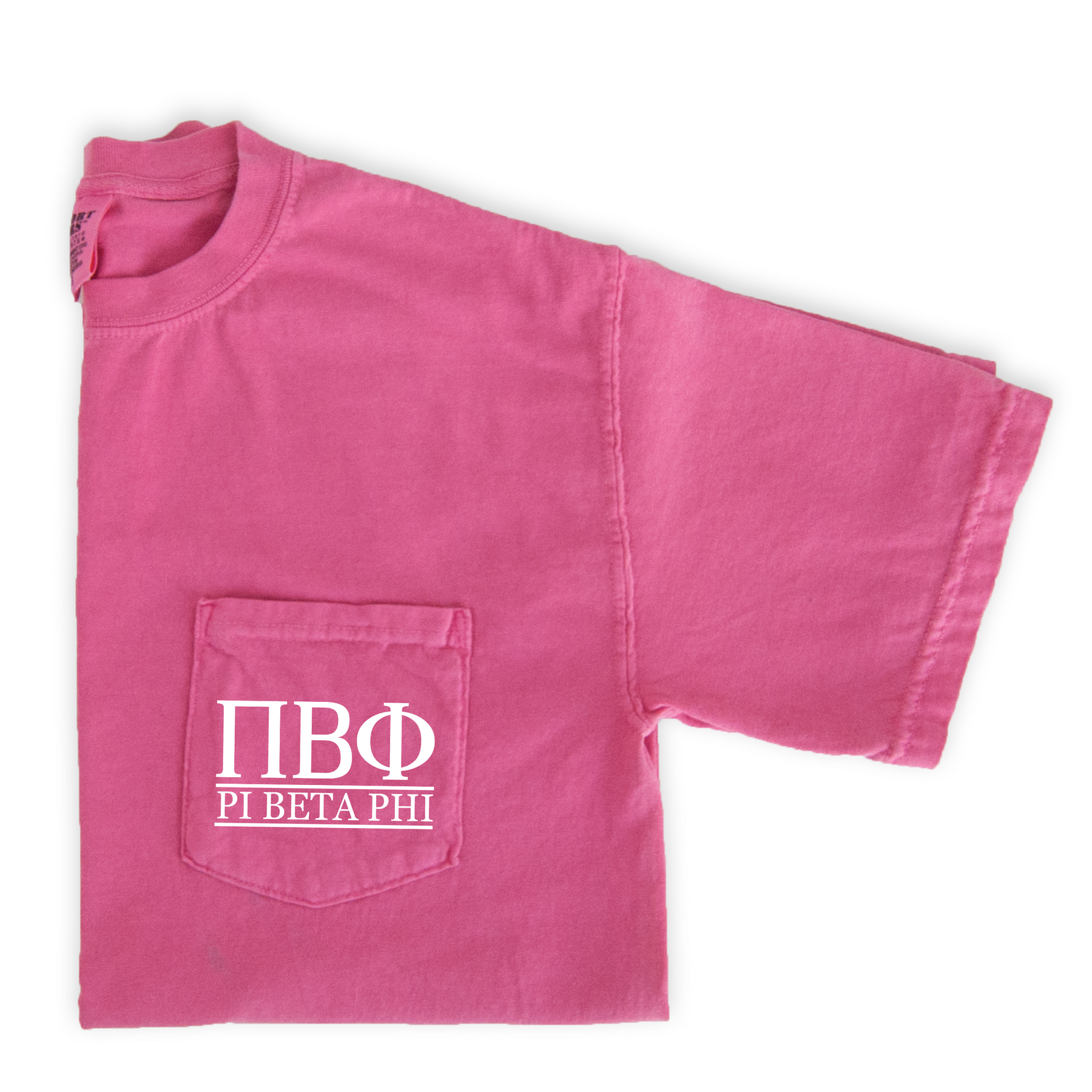 Celebrate sisterhood with the Pi Beta Phi Block Letters Pocket Tee! This officially licensed comfort colors shirt is perfect for showcasing your sorority pride. The pink color adds a playful touch to the classic collegiate design. Stylish and comfortable - a win-win for any Pi Beta Phi member!
